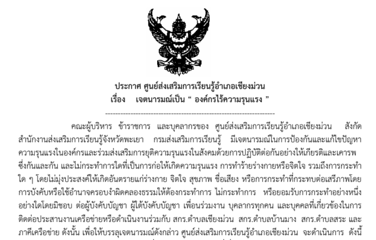 ประกาศ ศูนย์ส่งเสริมการเรียนรู้อำเภอเชียงม่วนเรื่อง เจตนารมณ์เป็น ” องค์กรไร้ความรุนแรง “
