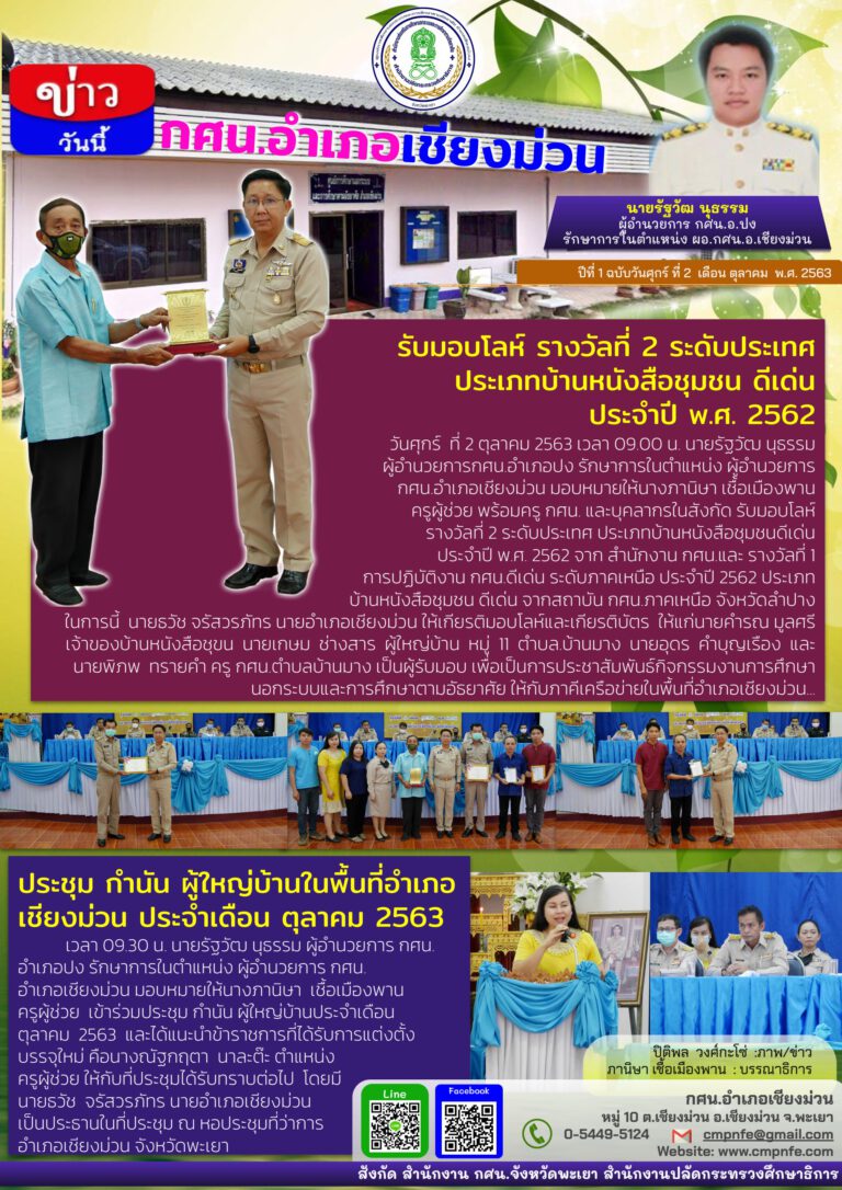 2 ตุลาคม 2563 มอบโลห์รางวัลบ้านหนังสือชุมชน และร่วมประชุมหัวหน้าส่วนราชการอำเภอเชียงม่วน