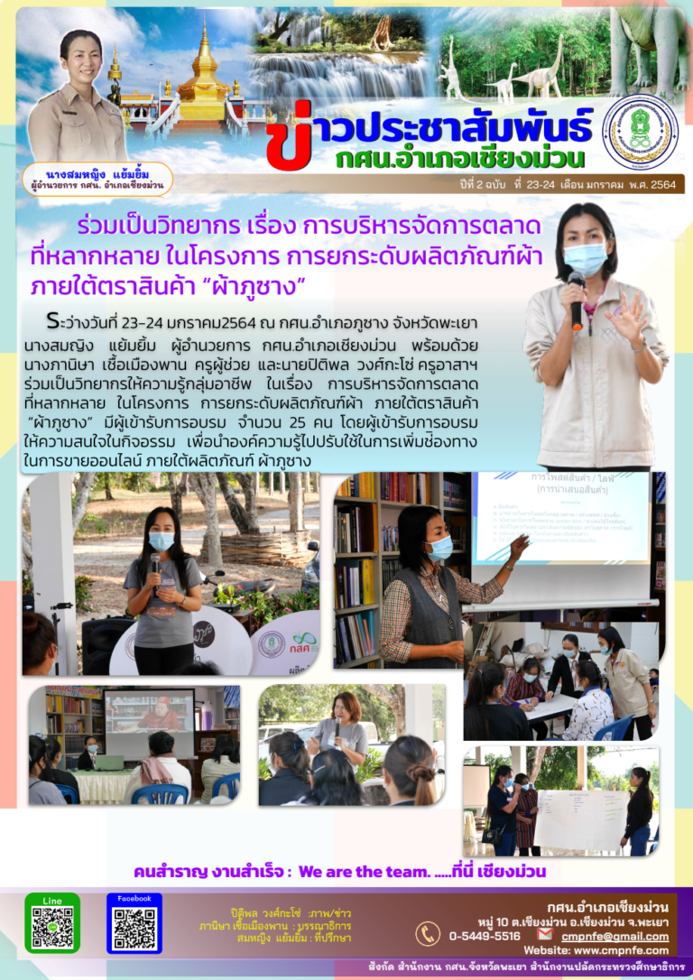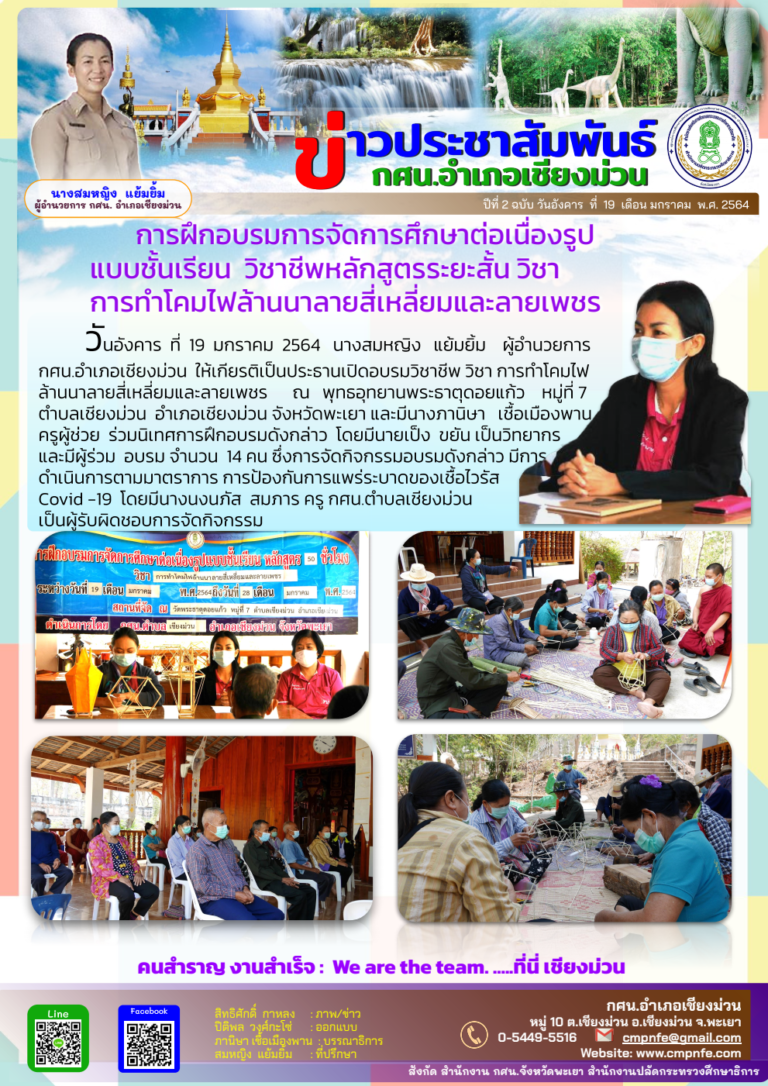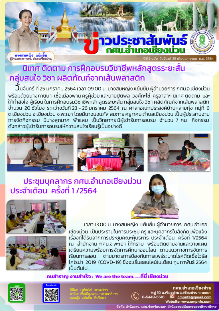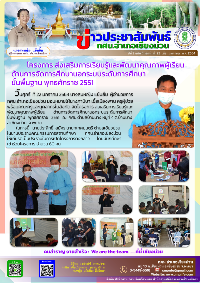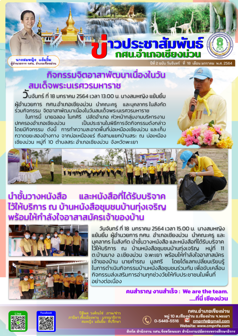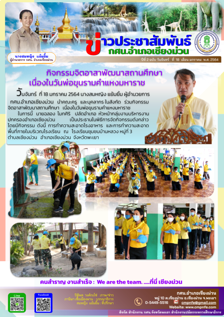 วันจันทร์ ที่ 18 มกราคม 2564 นางสมหญิง แย้มยิ้ม ผู้อำนวยการกศน.อำเภอเชียงม่วน นำคณะครู และบุคลากร ในสังกัด ร่วมกิจกรรมจิตอาสาพัฒนาสถานศึกษา เนื่องในวันพ่อขุนรามคำแหงมหาราช ในการนี้ นายฉลอง โมกศิริ ปลัดอำเภอ หัวหน้ากลุ่มงานบริหารงานปกครองอำเภอเชียงม่วน เป็นประธานในพิธีการจัดกิจกรรมดังกล่าว โดยมีกิจกรรม ดังนี้ การทำความสะอาดโรงอาหาร และการทำความสะอาดพื้นที่ภายในบริเวณโรงเรียน