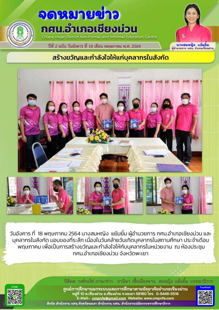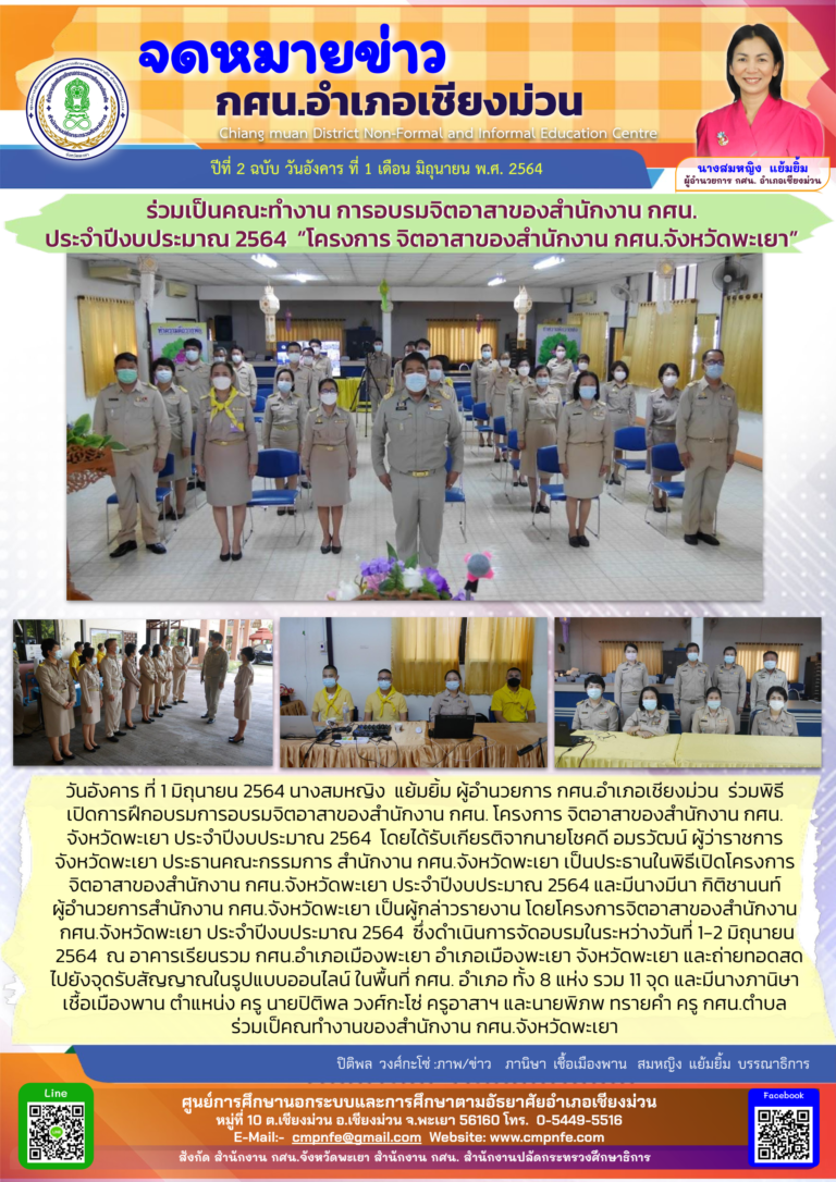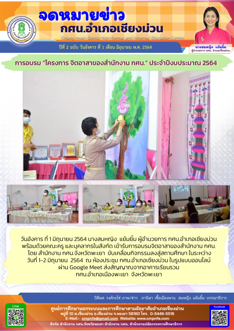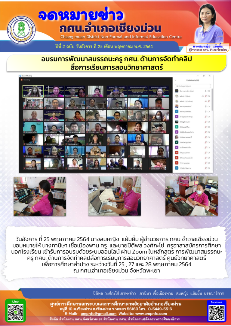 วันอังคาร ที่ 25 พฤษภาคม 2564 นางสมหญิง แย้มยิ้ม ผู้อำนวยการ กศน.อำเภอเชียงม่วน มอบหมายให้ นางภานิษา เชื้อเมืองพาน ครู และนายปิติพล วงศ์กะโซ่ ครูอาสาสมัครการศึกษานอกโรงเรียน เข้ารับการอบรมด้วยระบบออนไลน์ ผ่าน Zoom ในหลักสูตร การพัฒนาสมรรถนะครู กศน. ด้านการจัดทำคลิปสื่อการเรียนการสอนวิทยาศาสตร์ ศูนย์วิทยาศาสตร์เพื่อการศึกษาลำปาง ระหว่างวันที่ 25 , 27 และ 28 พฤษภาคม 2564 ณ กศน.อำเภอเชียงม่วน จังหวั