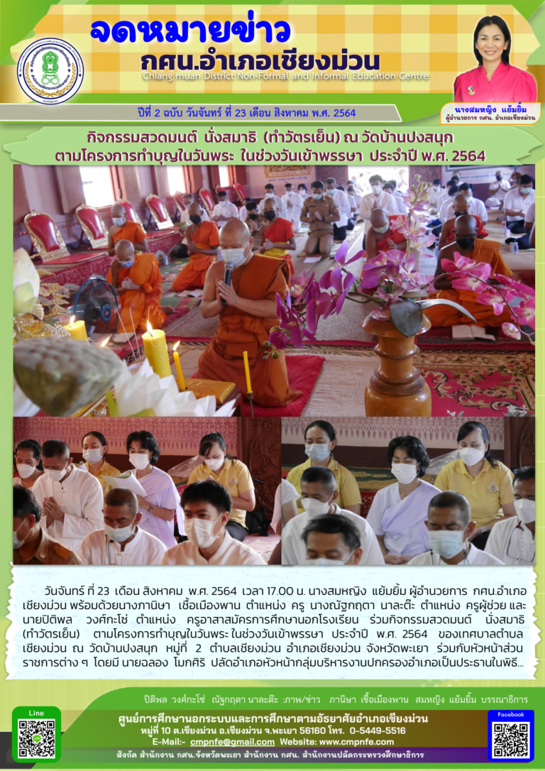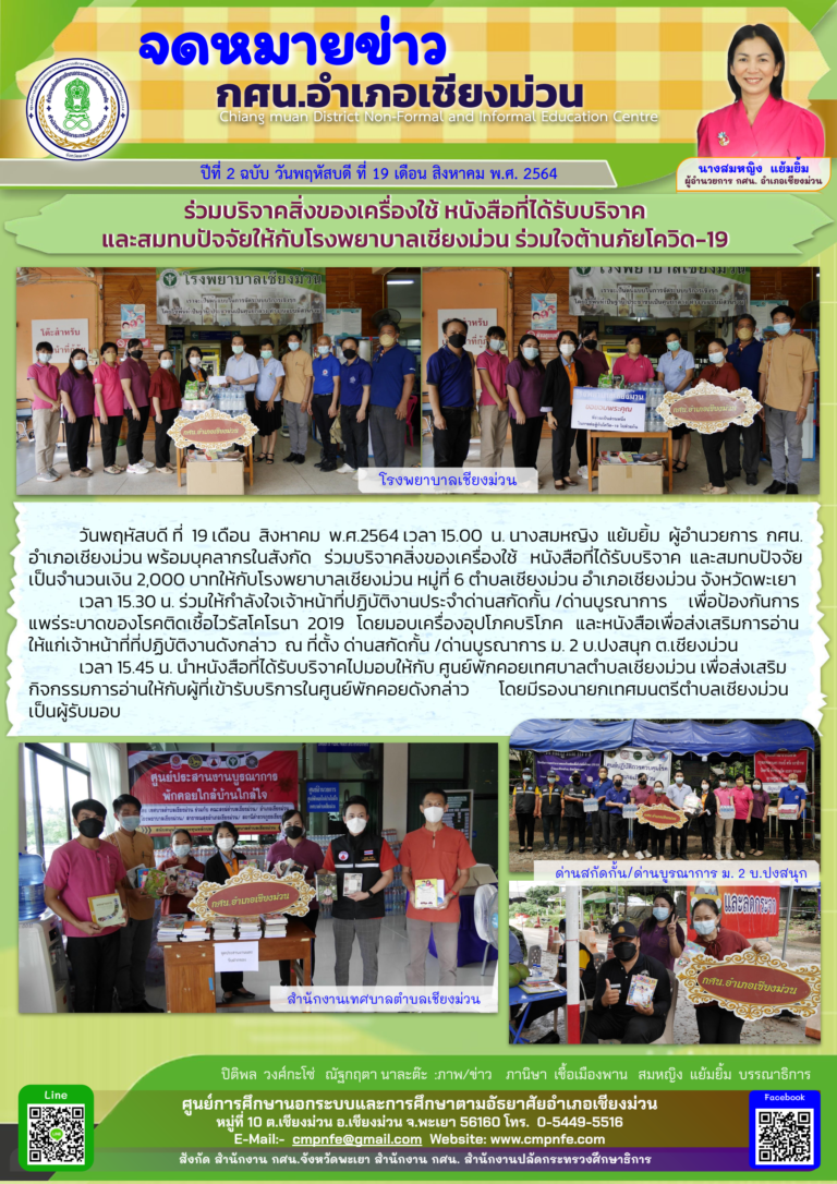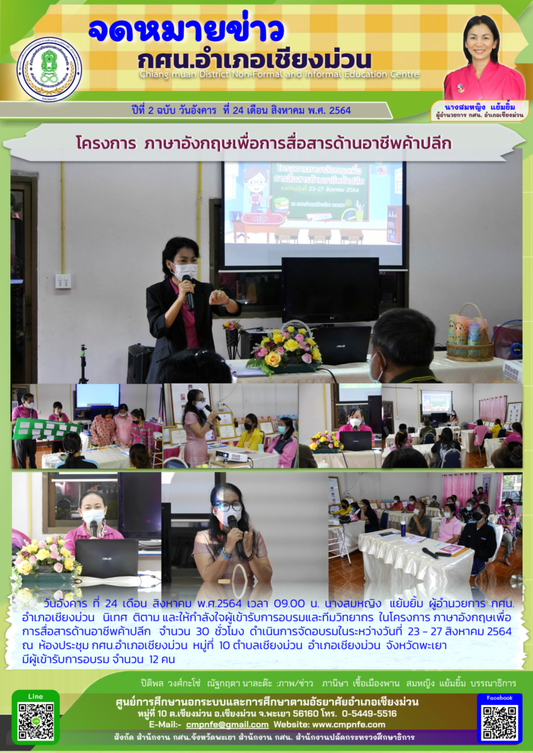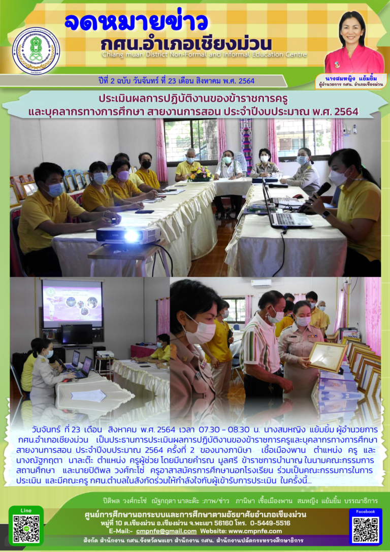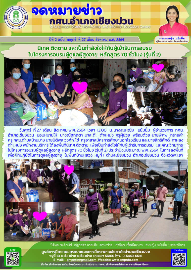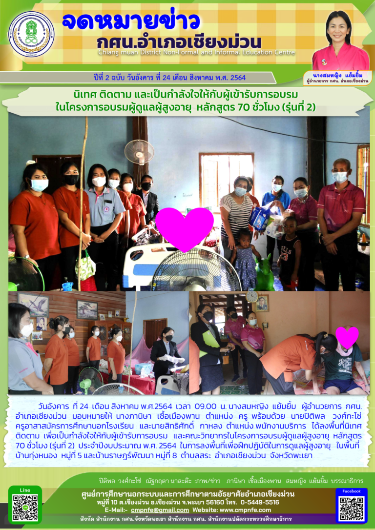 วันพุธ ที่ 25 เดือน สิงหาคม พ.ศ.2564 นางสมหญิง แย้มยิ้ม ผู้อำนวยการ กศน.อำเภอเชียงม่วนมอบหมายให้ครูและบุคลากรในสังกัด ได้ลงพื้นที่นิเทศ ติดตาม เพื่อเป็นกำลังใจให้กับผู้เข้ารับการอบรม และคณะวิทยากร ในโครงการอบรมผู้ดูแลผู้สูงอายุ หลักสูตร 70 ชั่วโมง (รุ่นที่ 2) ประจำปีงบประมาณ พ.ศ. 2564 จำนวน 2 พื้นที่ ประกอบด้วย...