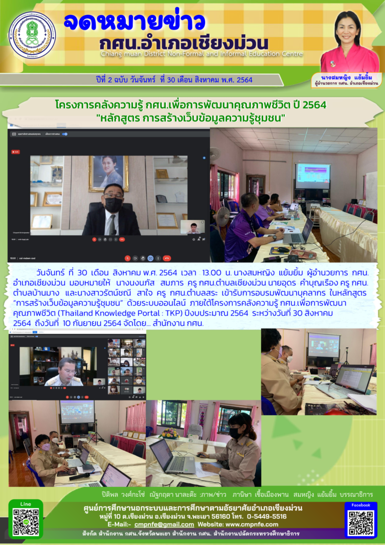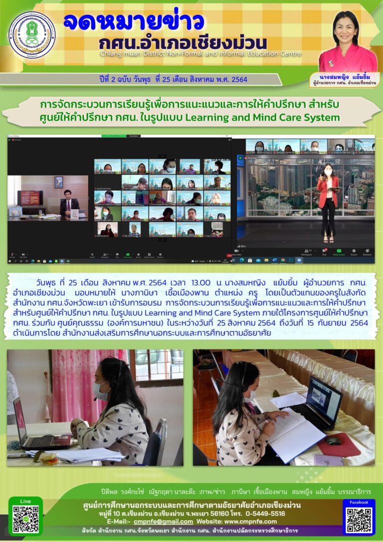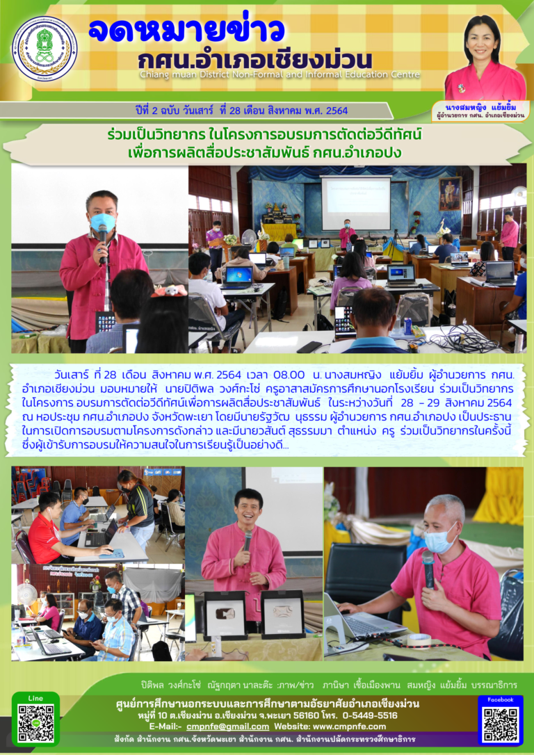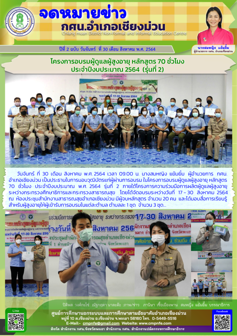 วันจันทร์ที่30เดือนสิงหาคมพ.ศ. 2564เวลา 09.00น. นางสมหญิงแย้มยิ้ม ผู้อำนวยการ กศน.อำเภอเชียงม่วน เป็นประธานในการมอบวุฒิบัตรแก่ผู้ผ่านการอบรม ในโครงการอบรมผู้ดูแลผู้สูงอายุ หลักสูตร70 ชั่วโมง ประจำปีงบประมาณ พ.ศ. 2564 รุ่นที่ 2 ภายใต้โครงการความร่วมมือการผลิตผู้ดูแลผู้สูงอายุระหว่างกระทรวงศึกษาธิการและกระทรวงสาธารณสุขโดยได้จัดอบรมระหว่างวันที่ 17 - 30 สิงหาคม2564ณ ห้องประชุมสำนักงานสาธารณสุขอำเภอเ