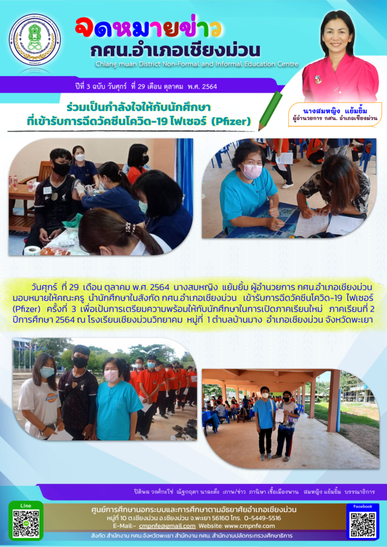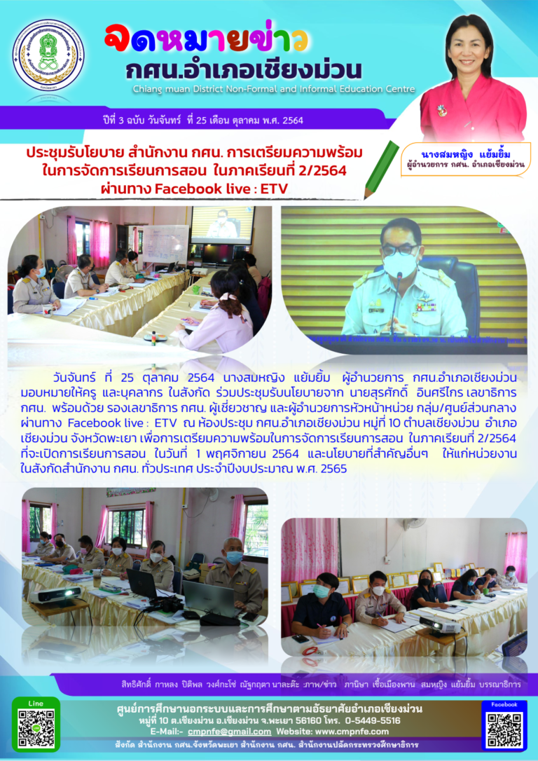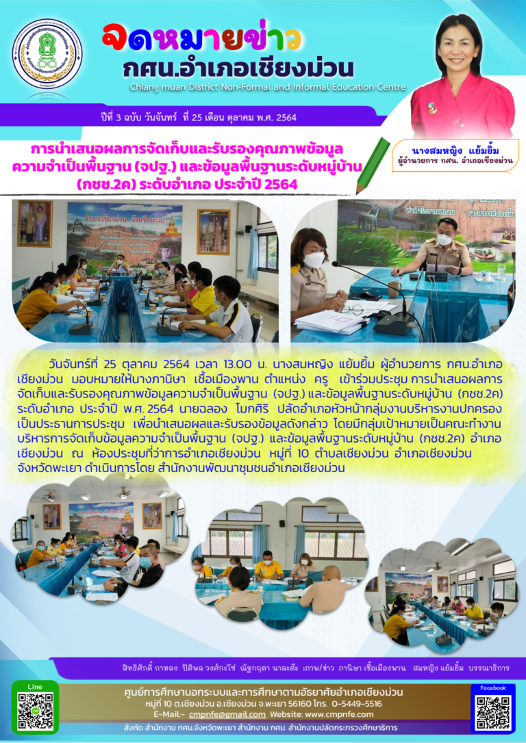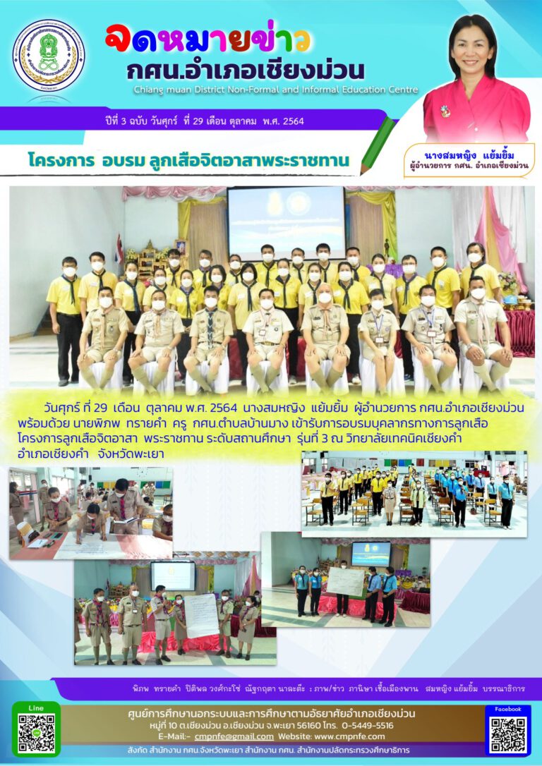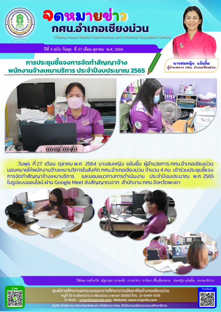 วันจันทร์ ที่ 1 พฤศจิกายน 2564 นางสมหญิง แย้มยิ้ม ผู้อำนวยการ กศน.อำเภอเชียงม่วน มอบหมายให้นายปิติพล วงศ์กะโซ่ ครูอาสาสมัครการศึกษานอกโรงเรียน ร่วมเป็นวิทยากรในโครงการพัฒนาบุคลากร ด้านการจัดทำเว็บไซต์และแหล่งเรียนรู้ออนไลน์ ประจำปีงบประมาณ 2564 ระหว่างวันที่ 1 - 3 พฤศจิกายน 2564 ณ ห้องประชุม กศน.อำเภอจุน ตำบลห้วยข้าวก่ำ อำเภอจุน จังหวัดพะเยาโดยมีนางวิลาวัลย์ ไชยมงคล ผู้อำนวยการ กศน.อำเภอ