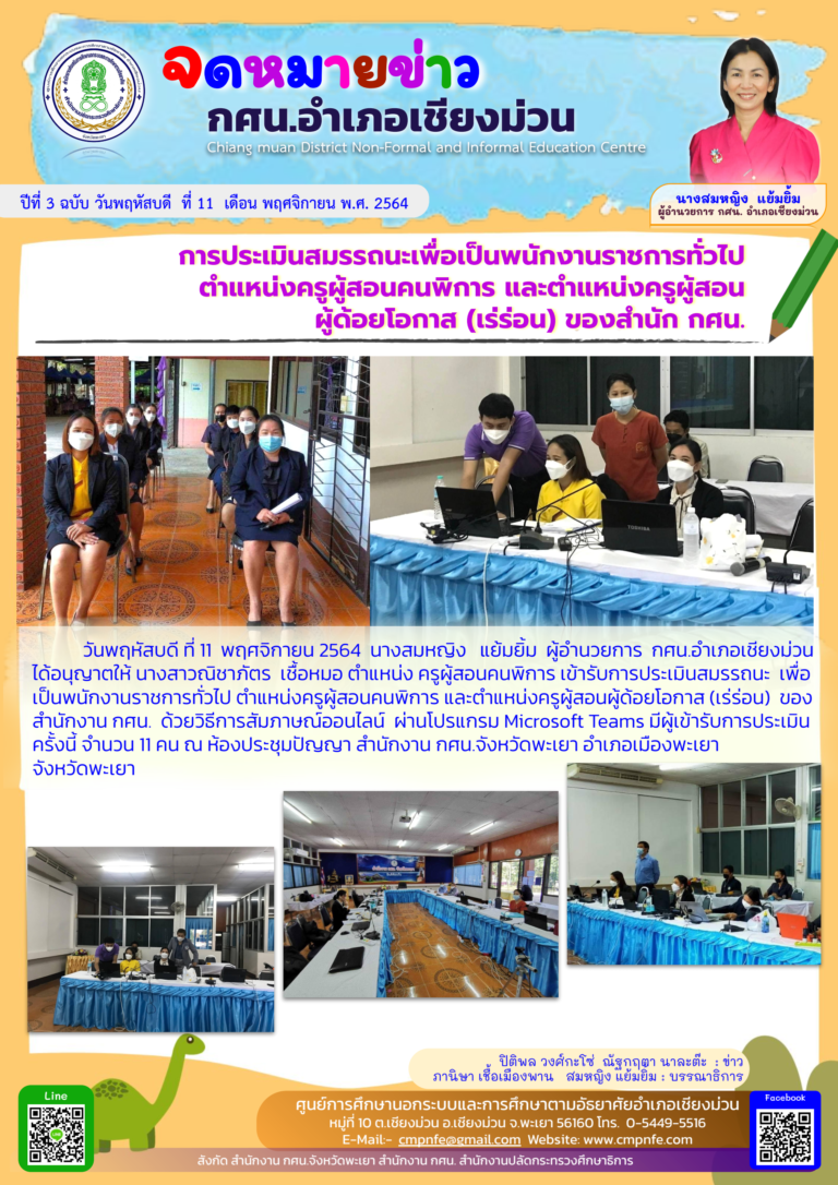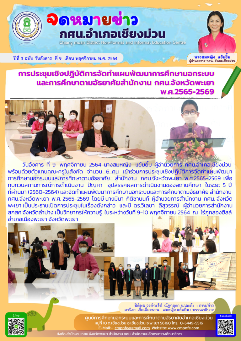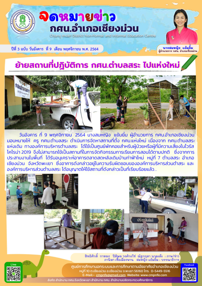 วันจันทร์ ที่ 15 พฤศจิกายน 2564 นางสมหญิง แย้มยิ้ม ผู้อำนวยการ กศน.อำเภอเชียงม่วน ได้ให้การต้อนรับ ผู้ตรวจการการเลือกตั้งประจำจังหวัดพะเยา ณ กศน.อำเภอเชียงม่วน จังหวัดพะเยา ในโอกาสที่เดินทางมาติดตามการขับเคลื่อนการดำเนินงานของศูนย์ส่งเสริมประชาธิปไตยประจำตำบลทั้ง 2 ตำบล ประกอบเด้วย ตำบลบ้านมาง และตำบลสระ เพื่อเตรียมความพร้อมในการเลือกตั้งนายกองค์การบริหารส่วนตำบล และสมาชิกองค