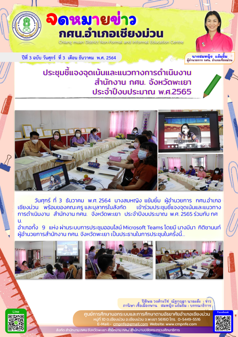 วันอังคาร ที่ 7 ธันวาคม 2564 เวลา 10.00 น. นางสมหญิง แย้มยิ้ม ผู้อำนวยการ กศน.มอบหมายให้นางภานิษา เชื้อเมืองพาน ตำแหน่ง ครู ร่วมเป็นเกียรติในพิธีเปิดโครงการฝึกอบรมเพิ่มประสิทธิภาพการปฏิบัติงานชุดรักษาความปลอดภัยหมู่บ้าน (ชรบ.) อำเภอเชียงม่วน โดยมีนายเทวา ปัญญาบุญ ปลัดจังหวัดพะเยา เป็นประธานในพิธี โดยมีว่าที่ร้อยโท บำรุง คำไวนายอำเภอเชียงม่วน พร้อมด้วยหัวหน้าส่วนราชการ ผู้บริหารอง