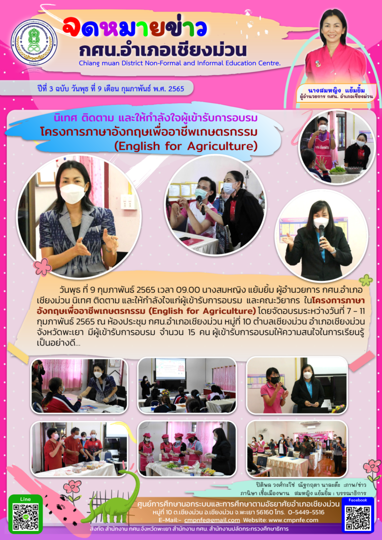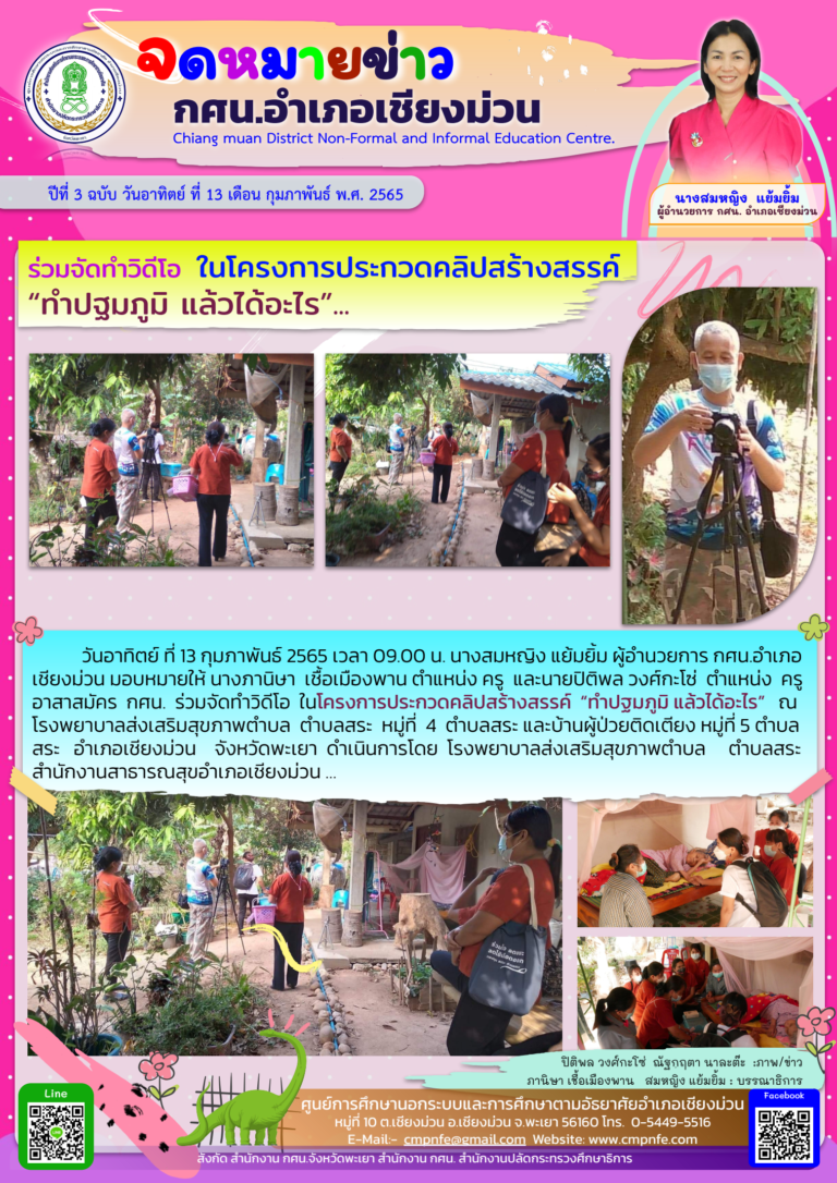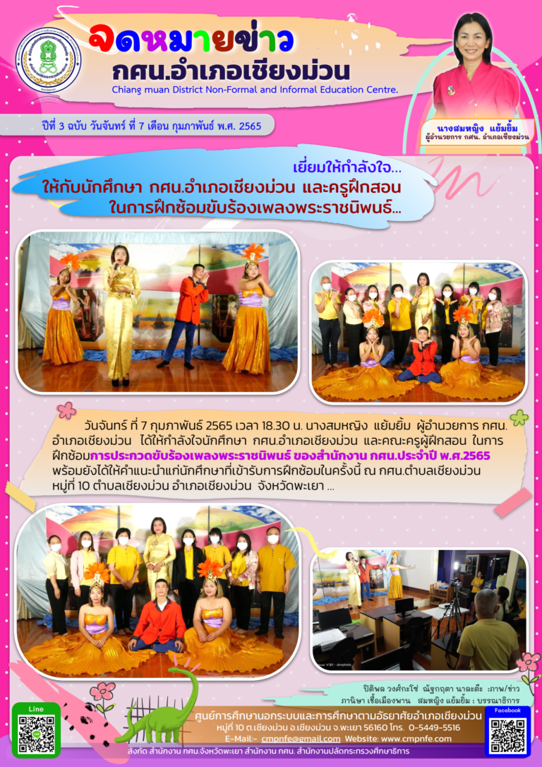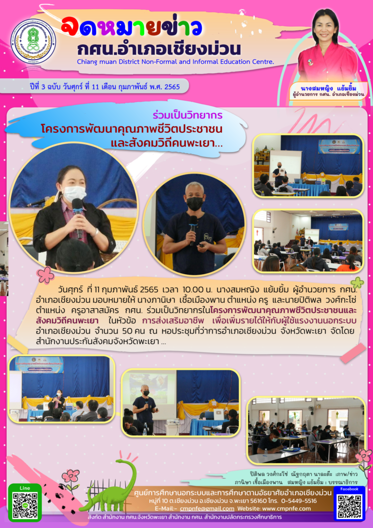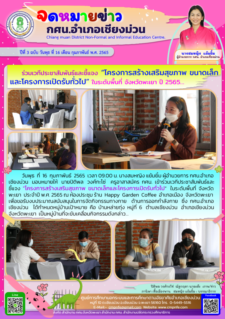 วันพุธ ที่ 16 กุมภาพันธ์ 2565 เวลา 09.00 น. นางสมหญิง แย้มยิ้ม ผู้อำนวยการ กศน.อำเภอเชียงม่วน มอบหมายให้ นายปิติพล วงศ์กะโซ่ ครูอาสาสมัคร กศน. เข้าร่วมเวทีประชาสัมพันธ์และชี้แจง “โครงการสร้างเสริมสุขภาพ ขนาดเล็กและโครงการเปิดรับทั่วไป” ในระดับพื้นที่ จังหวัดพะเยา ประจำปี พ.ศ. 2565 ณ ห้องประชุม ร้าน Happy Garden Coffee อำเภอเมืองพะเยา จังหวัดพะเยาเพื่อขอรับงบประมาณสนับสนุนในการจัด