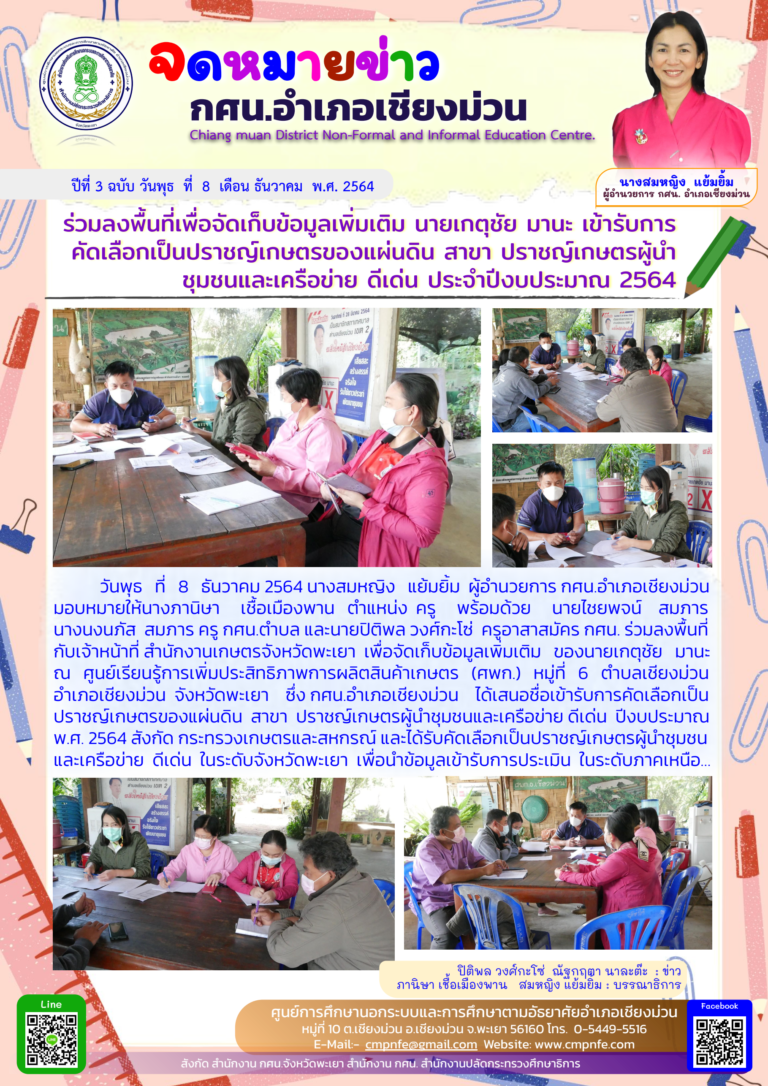 วันพุธ ที่ 8 ธันวาคม 2564 นางสมหญิง แย้มยิ้ม ผู้อำนวยการ กศน.อำเภอเชียงม่วน มอบหมายให้นางภานิษา เชื้อเมืองพาน ตำแหน่ง ครู พร้อมด้วย นายไชยพจน์ สมภารนางนงนภัส สมภาร ครู กศน.ตำบล และนายปิติพล วงศ์กะโซ่ ครูอาสาสมัคร กศน. ร่วมลงพื้นที่กับเจ้าหน้าที่ สำนักงานเกษตรจังหวัดพะเยา เพื่อจัดเก็บข้อมูลเพิ่มเติม ของนายเกตุชัย มานะณ ศูนย์เรียนรู้การเพิ่มประสิทธิภาพก