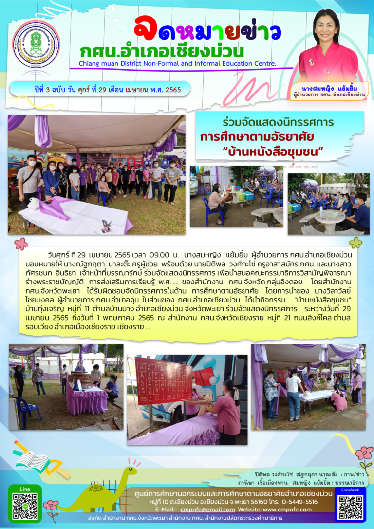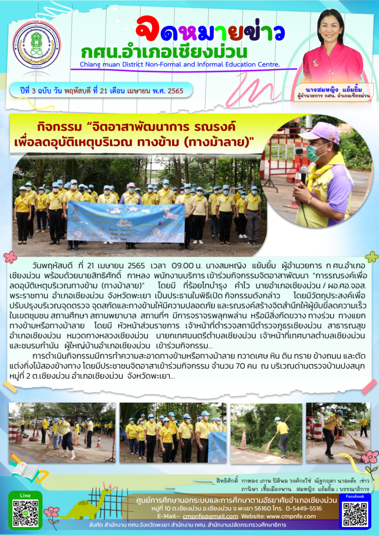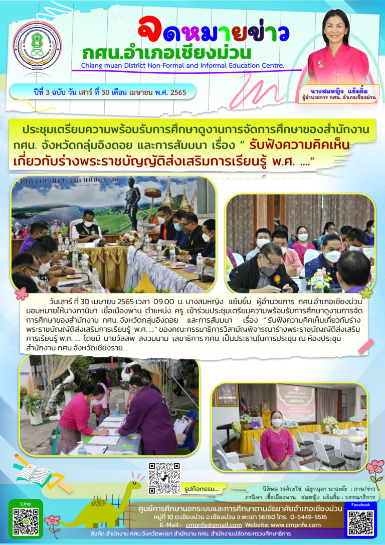 วันเสาร์ ที่ 30 เมษายน 2565 เวลา 14.30 น. นางสมหญิง แย้มยิ้ม ผู้อำนวยการ กศน.อำเภอเชียงม่วน มอบหมายให้ นายปิติพล วงศ์กะโซ่ ครูอาสาสมัครฯ ร่วมเป็นคณะทำงานในการบันทึกภาพและวิดีโอของสำนักงาน กศน.จังหวัดพะเยา ในการลงพื้นที่เยี่ยมบ้านผู้พิการตามโครงการปักหมุดคนพิการ และรับฟังความคิดเห็นร่างพระราชบัญญัติส่งเสริมการเรียนรู้ พ.ศ .... ของคณะกรรมาธิการวิสามัญพิจารณาร่างพระราชบัญญัติส่งเสริมการเรียนรู