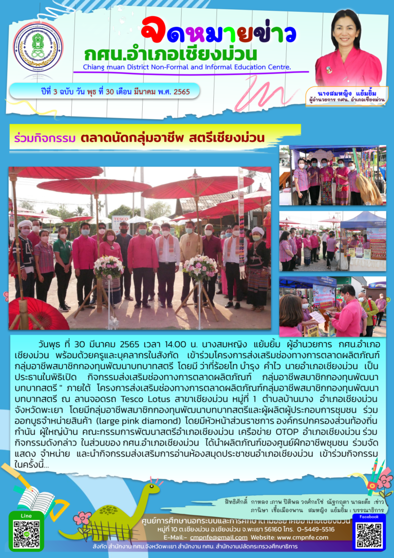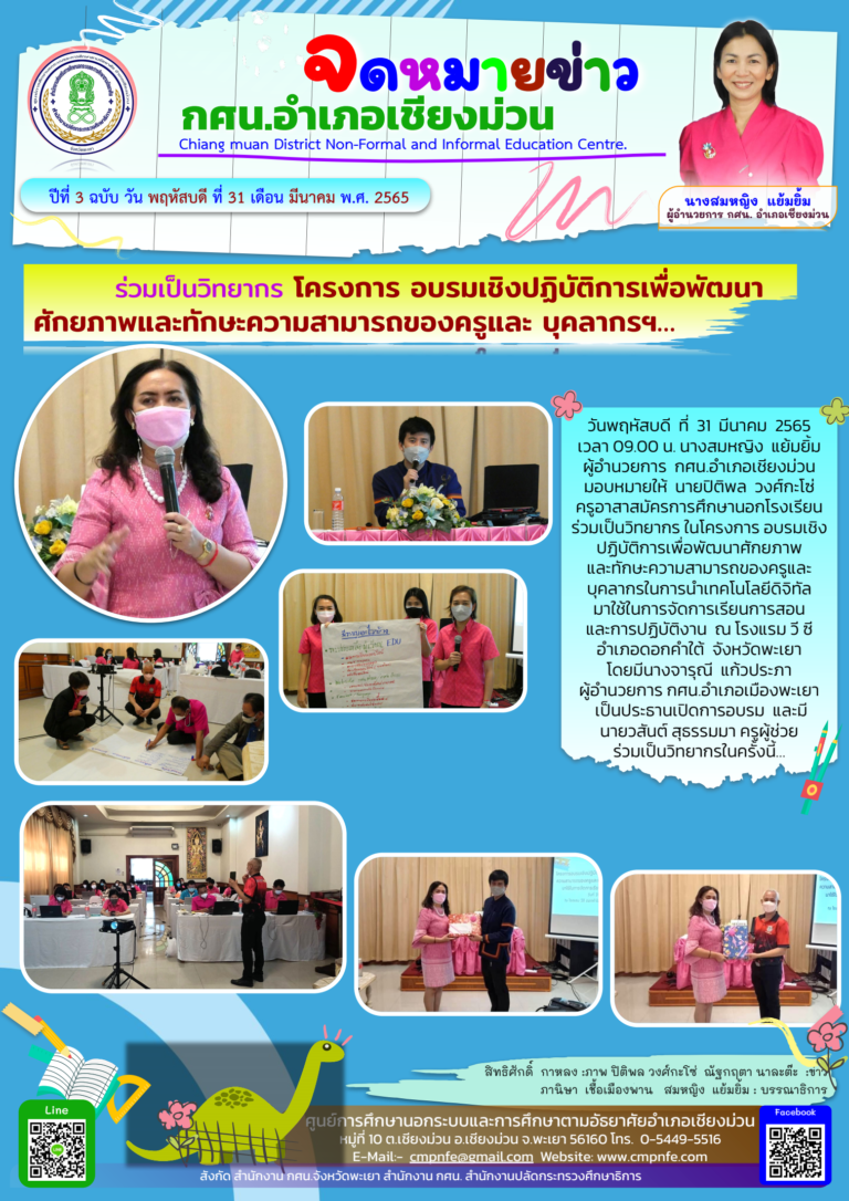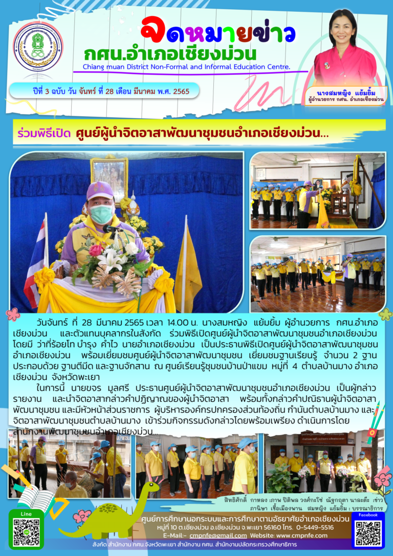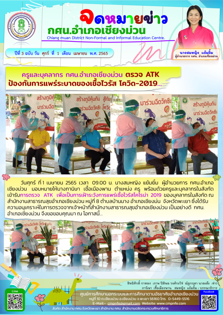 วันเสาร์ ที่ 2 เมษายน 2565 เวลา 06.30 น. นางสมหญิง แย้มยิ้ม ผู้อำนวยการ กศน.อำเภอเชียงม่วน พร้อมด้วยครูและบุคลากรในสังกัด เข้าร่วมกิจกรรม “วิ่งเอาม่วน ชวนกันวิ่ง” อำเภอเชียงม่วน ทุกวันเสาร์แรกของเดือน ครั้งที่ 5 โดยมี นายฉลอง โมกศิริ ปลัดอำเภอหัวหน้ากลุ่มบริหารงานปกครองอำเภอเชียงม่วน เป็นประธานในการปล่อยตัวนักกีฬา โดยมีหัวหน้าส่วนราชการ ข้าราชการ ลูกจ้าง และประชาชนในพื้นที่ตำบลเชียงม่วน เข้าร