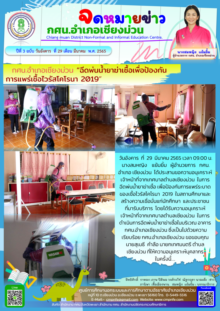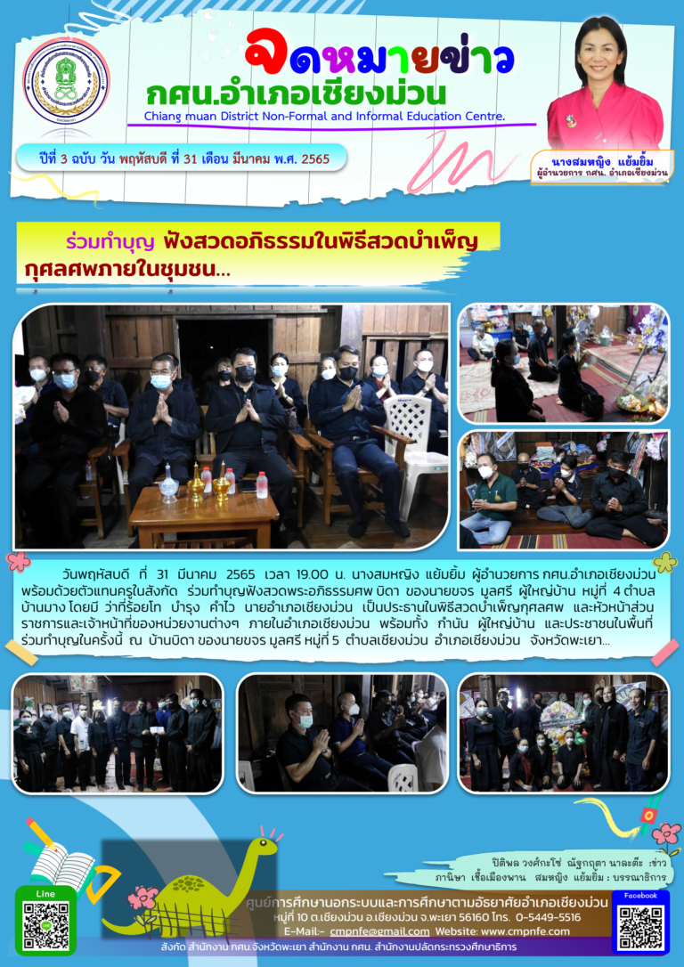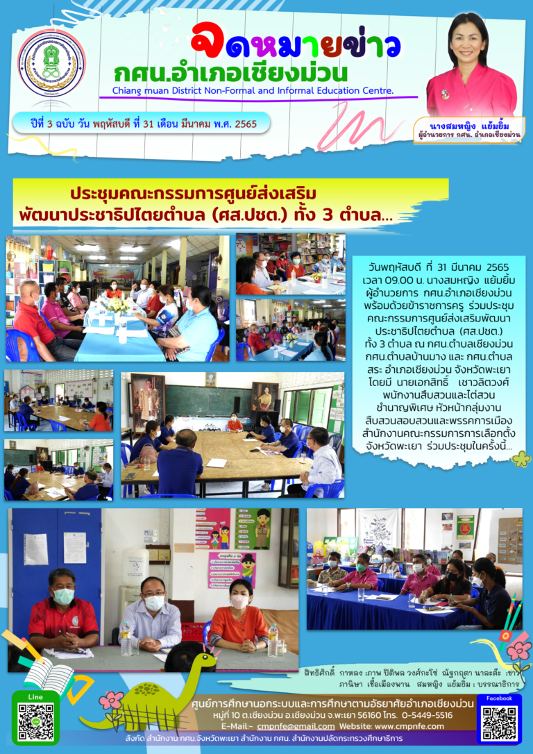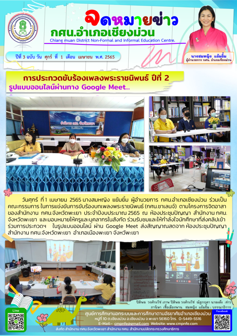 วันเสาร์ ที่ 2 เมษายน 2565 เวลา 06.30 น. นางสมหญิง แย้มยิ้ม ผู้อำนวยการ กศน.อำเภอเชียงม่วน พร้อมด้วยครูและบุคลากรในสังกัด เข้าร่วมกิจกรรม “วิ่งเอาม่วน ชวนกันวิ่ง” อำเภอเชียงม่วน ทุกวันเสาร์แรกของเดือน ครั้งที่ 5 โดยมี นายฉลอง โมกศิริ ปลัดอำเภอหัวหน้ากลุ่มบริหารงานปกครองอำเภอเชียงม่วน เป็นประธานในการปล่อยตัวนักกีฬา โดยมีหัวหน้าส่วนราชการ ข้าราชการ ลูกจ้าง และประชาชนในพื้นที่ตำบลเชียงม่วน เข้าร