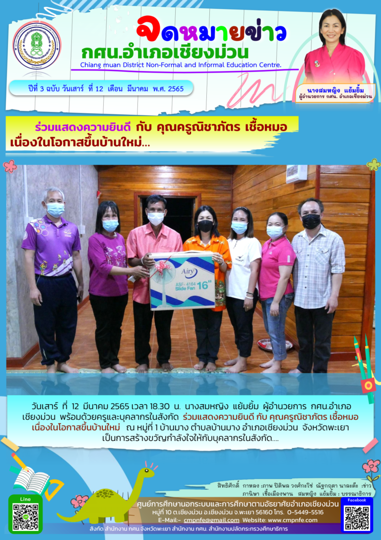 วันเสาร์ ที่ 12 มีนาคม 2565 เวลา 18.30 น. นางสมหญิง แย้มยิ้ม ผู้อำนวยการ กศน.อำเภอเชียงม่วน พร้อมด้วยครูและบุคลากรในสังกัด ร่วมแสดงความยินดี กับ คุณครูณิชาภัตร เชื้อหมอ เนื่องในโอกาสขึ้นบ้านใหม่ ณ หมู่ที่ 1 บ้านมาง ตำบลบ้านมาง อำเภอเชียงม่วน จังหวัดพะเยา เป็นการสร้างขวัญกำลังใจให้กับบุคลากรในสังกัด….