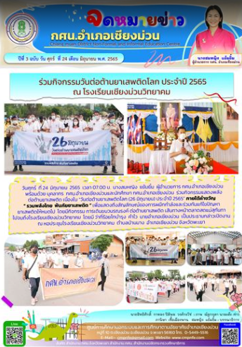 24 มิถุนายน 2565 ร่วมกิจกรรมวันต่อต้านยาเสพติดโลก ประจำปี 2565 ณ โรงเรียนเชียงม่วนวิทยาคม…