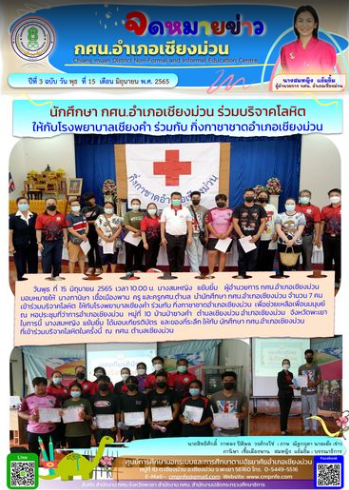 15 มิถุนายน 2565 นักศึกษา กศน.อำเภอเชียงม่วน ร่วมบริจาคโลหิตให้กับโรงพยาบาลเชียงคำ ร่วมกับ กิ่งกาชาชาดอำเภอเชียงม่วน…