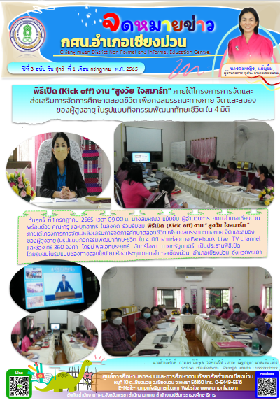 1 กรกฎาคม 2565 พิธีเปิด (Kick off) งาน “สูงวัย ใจสมาร์ท” ภายใต้โครงการการจัดและส่งเสริมการจัดการศึกษาตลอดชีวิต เพื่อคงสมรรถนะทางกาย จิต และสมองของผู้สูงอายุ ในรูปแบบกิจกรรมพัฒนาทักษะชีวิต ใน 4 มิติ