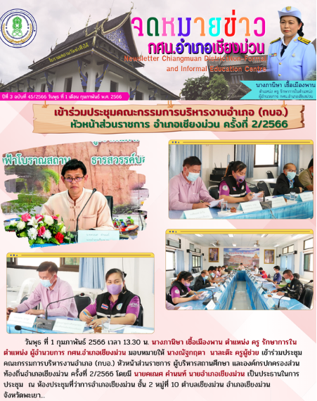 1 กุมภาพันธ์ 2566 เข้าร่วมประชุมคณะกรรมการบริหารงานอำเภอ (กบอ.) หัวหน้าส่วนราชการ ผู้บริหารสถานศึกษา และองค์กรปกครองส่วนท้องถิ่นอำเภอเชียงม่วน ครั้งที่ 2/2566