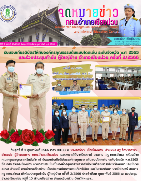 3 กุมภาพันธ์ 2566 เข้ารับมอบใบเกียติบัตรองค์กรคุณธรรมต้นแบบโดดเด่น ระดับจังหวัด พ.ศ.2565