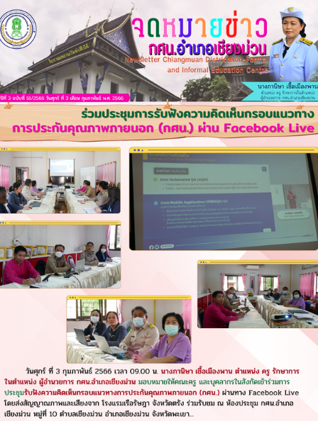 3 กุมภาพันธ์ 2566 เข้าร่วมการประชุมรับฟังความคิดเห็นกรอบแนวทางการประกันคุณภาพภายนอก (กศน.) ผ่านทาง Facebook Live…