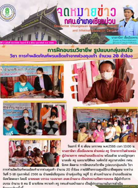 4 กุมภาพันธ์ 2566 นิเทศ ติดตาม การฝึกอบรมวิชาชีพ รูปแบบกลุ่มสนใจ วิชา การทำผลิตภัณฑ์พรมเช็ดเท้าจากห่วงถุงเท้า จำนวน 20 ชั่วโมง…