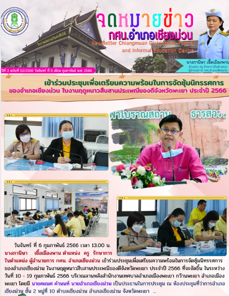6 กุมภาพันธ์ 2566 เข้าร่วมประชุมเพื่อเตรียมความพร้อมในการจัดซุ้มนิทรรศการ ของอำเภอเชียงม่วน ในงานฤดูหนาวสืบสานประเพณีของดีจังหวัดพะเยา ประจำปี 2566