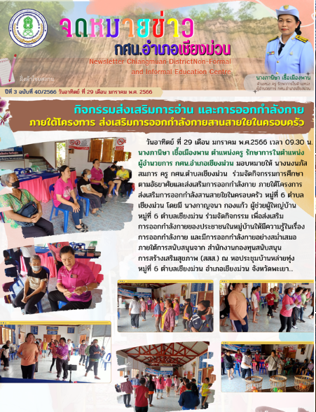 29 มกราคม 2566 ร่วมจัดกิจกรรมการศึกษาตามอัธยาศัยและส่งเสริมการออกกำลังกาย ภายใต้โครงการ ส่งเสริมการออกกำลังสานสายใยในครอบครัว หมู่ที่ 6 ตำบลเชียงม่วน