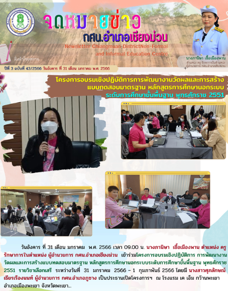 31 มกราคม 2566 เข้าร่วมโครงการอบรมเชิงปฏิบัติการ การพัฒนางานวัดผลและการสร้างแบบทดสอบมาตรฐาน หลักสูตรการศึกษานอกระบบระดับการศึกษาขั้นพื้นฐาน พุทธศักราช 2551…