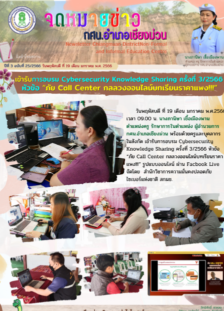 19 มกราคม 2566 เข้ารับการอบรม Cybersecurity Knowledge Sharing ครั้งที่ 3/2566 หัวข้อ “ภัย Call Center กลลวงออนไลน์บทเรียนราคาแพง!!!” รูปแบบออนไลน์ ผ่าน Facbook Live
