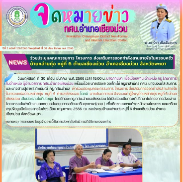 วันพฤหัสบดี ที่ 30 เดือน มีนาคม พ.ศ. 2566 เวลา 19.00 น. นางภานิษา เชื้อเมืองพาน ตำแหน่ง ครู รักษาการ ในตำแหน่ง ผู้อำนวยการ กศน.อำเภอเชียงม่วน พร้อมด้วย นายปิติพล วงศ์กะโซ่ ครูอาสามัคร กศน. นางนงนภัส สมภาร และนางสามสุดาพร ทิพย์มณี ครู กศน.ตำบล เข้าร่วมประชุมคณะกรรมการ โครงการ ส่งเสริมการออกกำลังสานสายใยในครอบครัวบ้านหล่ายทุ่ง หมู่ที่ 6 ตำบลเชียงม่วน โดยมี นายประภากรณ์ ปิจจะวงค์ ผู้ใหญ่บ้านหล่ายทุ่