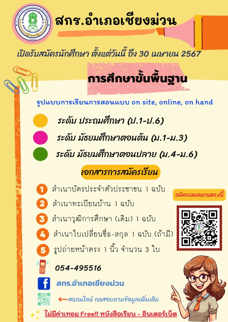 ประชาสัมพันธ์รับสมัครนักศึกษา ของ สกร.อำเภอเชียงม่วนนะคะประจำภาคเรียนที่ 1 ปีการศึกษา 2567ตั้งแต่บัดนี้ จนถึง วันที่ 30 เมษายน 2567สมัครเรียนได้ ทางออนไลน์ผ่านเฟซบุ๊ก-ไลน์ / หรือ สกร.อำเภอเชียงม่วน / ศกร.ตำบลทุกแห่ง(ผู้ที่สนใจสมัครเรียน ต้องมีอายุตั้งแต่ 15 ปีขึ้นไป)รายละเอียดใบสมัครเรียน ตามลิ้งค์นี้นะคะhttps://forms.gle/7bhydpAWbupCdMDq8
