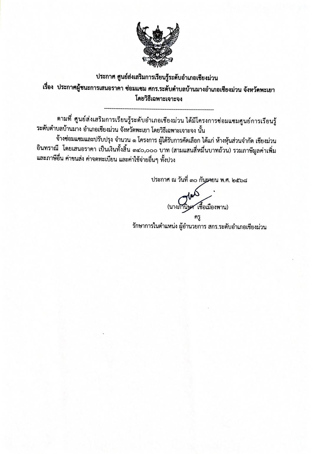 ประกาศ ศูนย์ส่งเสริมการเรียนรู้ระดับอำเภอเชียงม่วน ประกาศผู้ชนะการเสนอราคา ซ่อมแซม ศกร.ระดับตำบลบ้านมางอำเภอเชียงม่วน จังหวัดพะเยา โดยวิธีเฉพาะเจาะจง