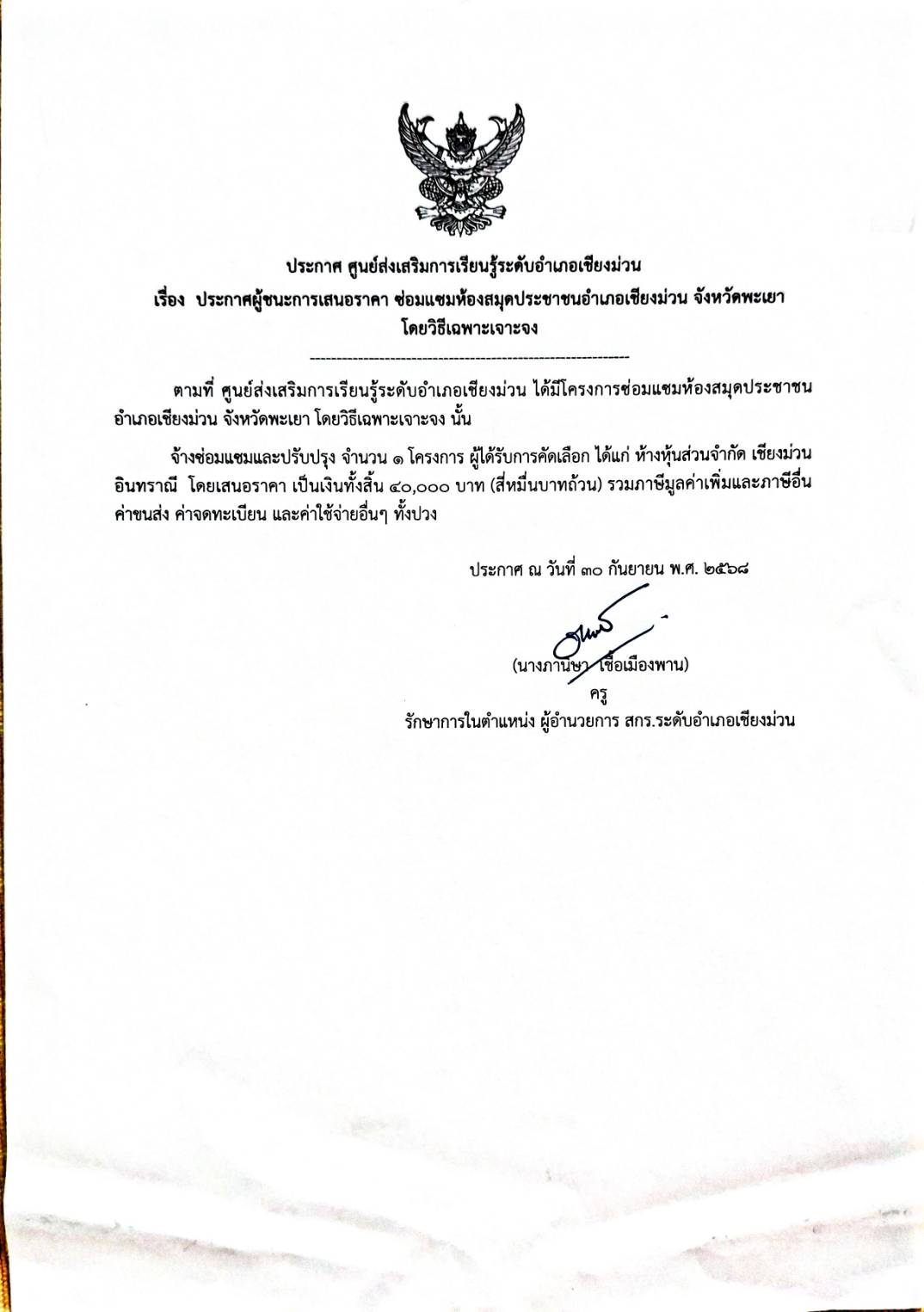 เรื่อง ประกาศผู้ชนะการเสนอราคา ซ่อมแซมห้องสมุดประชาชนอำเภอเชียงม่วน จังหวัดพะเยา